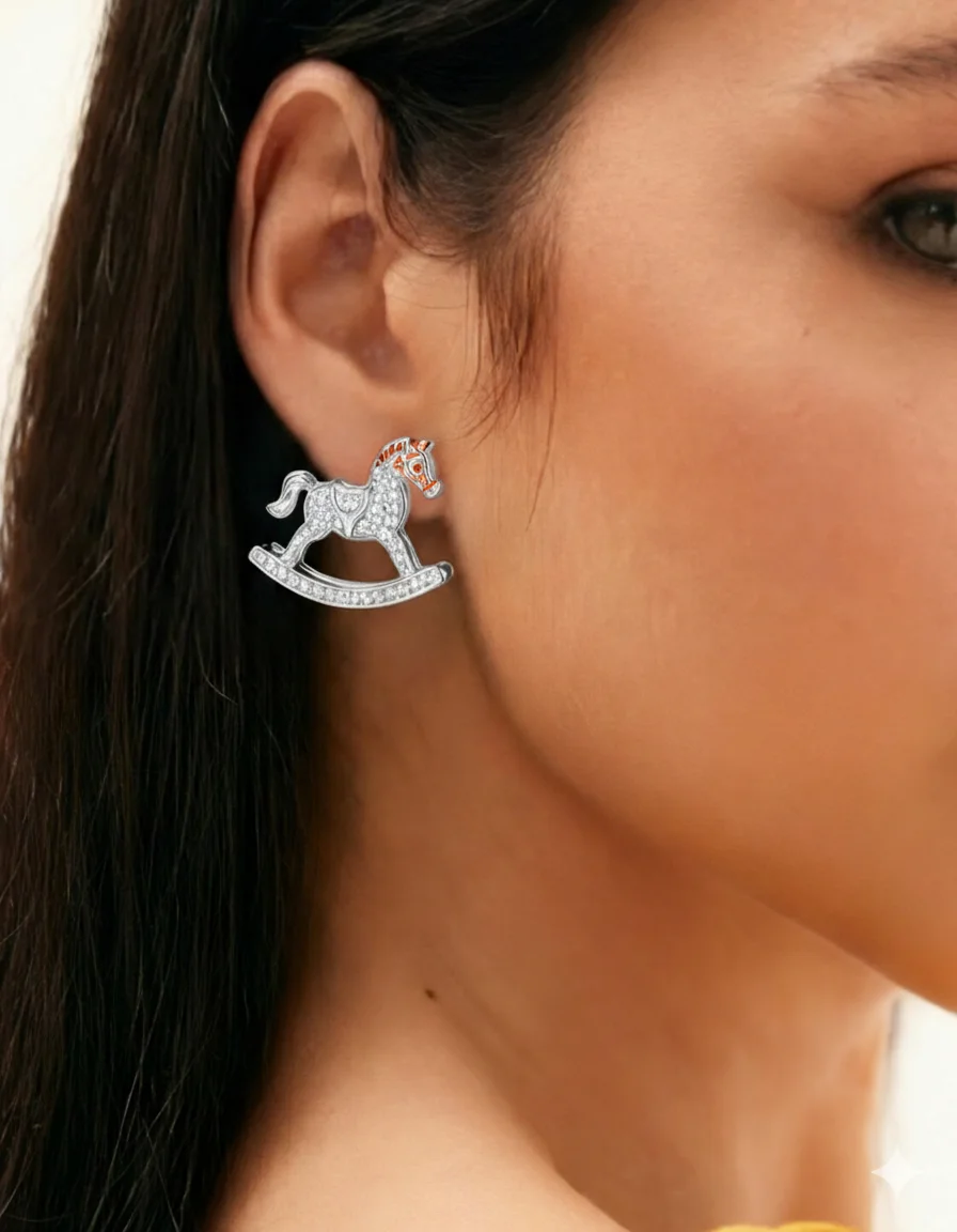 Look at the most charming earrings you will ever see! Do you miss the fun and magic of being a kid? Our Rocking Horse Silver Earrings are here to bring a big smile to your face. Most jewelry is very serious, but these are all about having fun and feeling happy. They feature a tiny, sweet rocking horse that looks like it came straight out of a dream. Why wear boring shapes when you can wear something that tells a happy story? The first thing you will notice is the bright, icy glow. These earrings are made with a high-quality silver finish that looks clean and very polished. The detail on the little horse is amazing! You can see the tiny rocker and the cute shape perfectly. They hang gently from your ears and move just a little bit when you walk, just like a real rocking horse. We made sure these are very lightweight, so they won’t pull on your ears at all. They are as comfortable as they are cute! Style these Rocking Horse Silver Earrings with a cozy sweater or a simple t-shirt to add a touch of “whimsy” to your day. They are a great conversation starter because everyone will want to see the tiny horses! They also make the most wonderful gift for a new mom, a teacher, or anyone who loves toys and nostalgia. These earrings stay shiny and look new for a long time. Don’t let your style get too serious. Add these silver horses to your cart today and enjoy the ride!